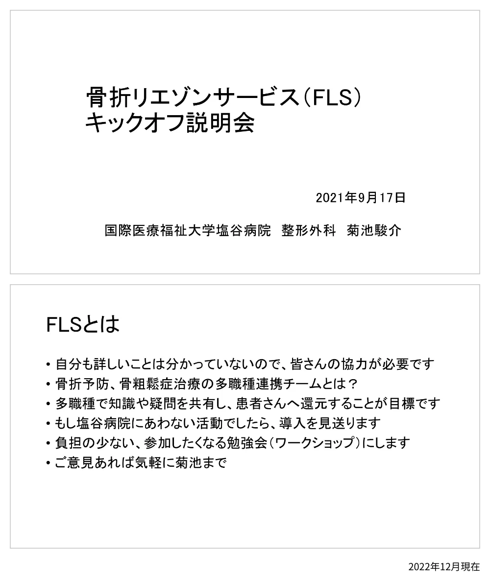 - 「多職種連携により骨折を予防する取り組み」であるFLSに関心を持った多職種に対してキックオフミーティングを開き、取り組みの内容について説明を行った。