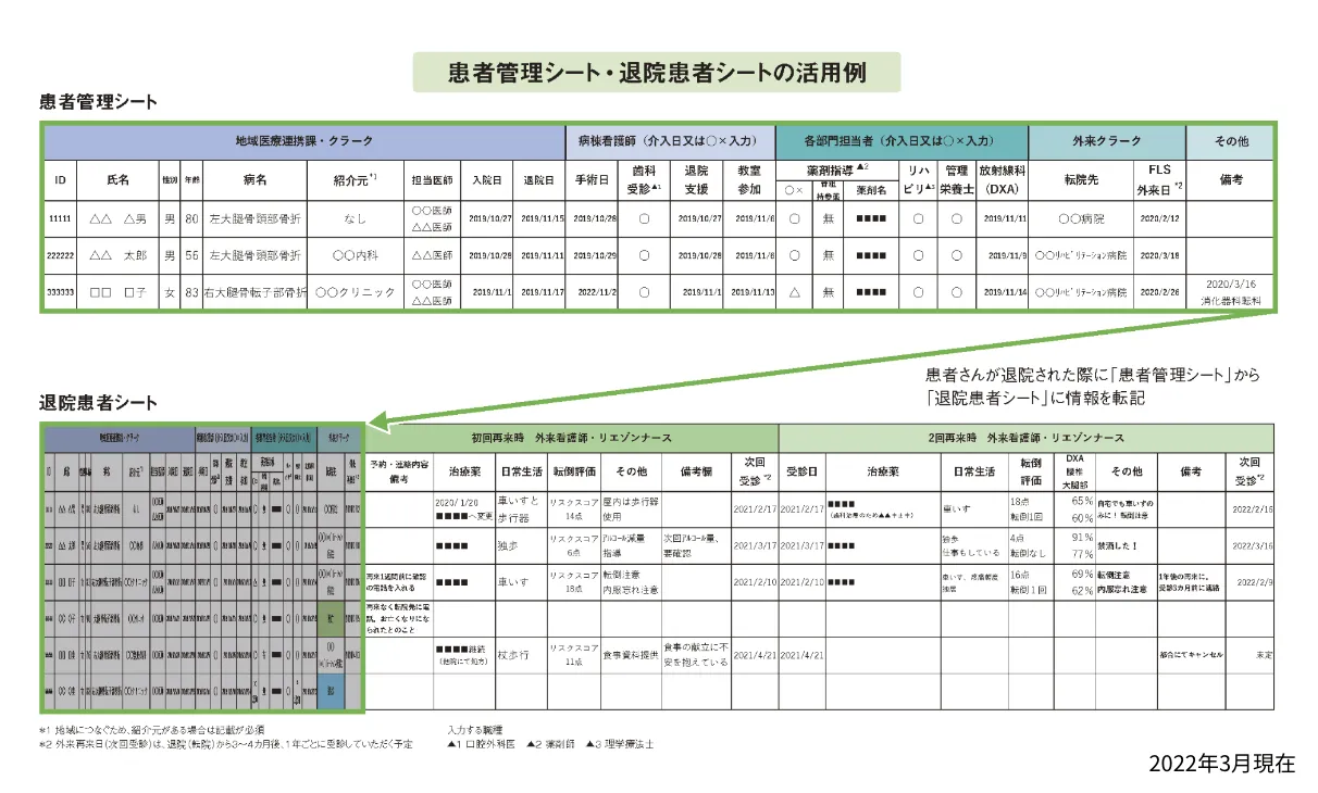 - リスト化されたデータベースは、2種のExcelシートで構成されている。患者さんの⼊院期間中は「患者管理シート」にFLSチームの多職種が⼊⼒する。退院後は情報を「退院患者シート」に転記し、主に外来看護師が⼊⼒する。