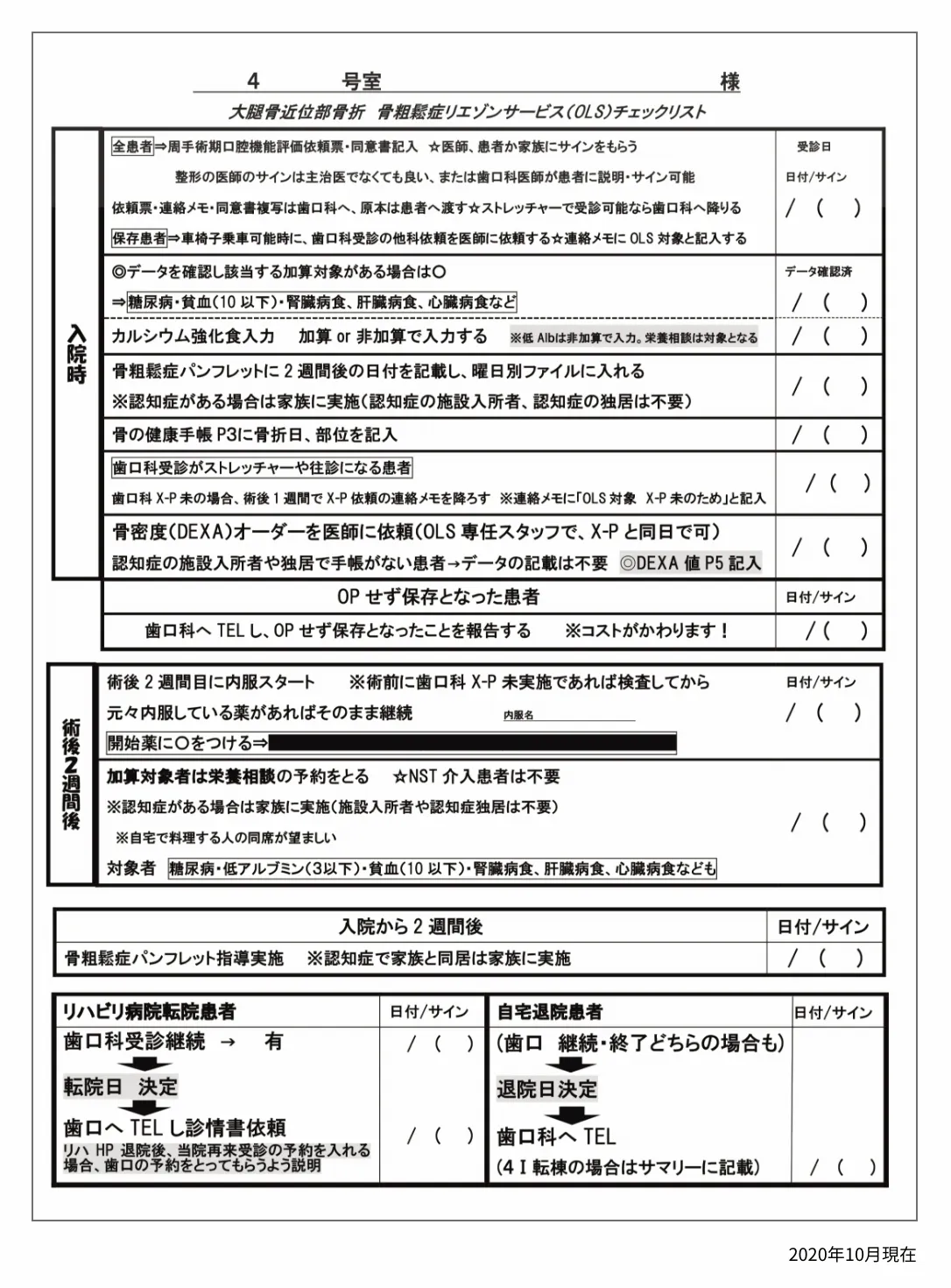 - FLSの運用時、対象患者さんのケアが漏れることがしばしばあったことから、患者さんの入院から退院までのケアの流れが示された「チェックリスト」を作成。コピーして患者さんごとに運用する。