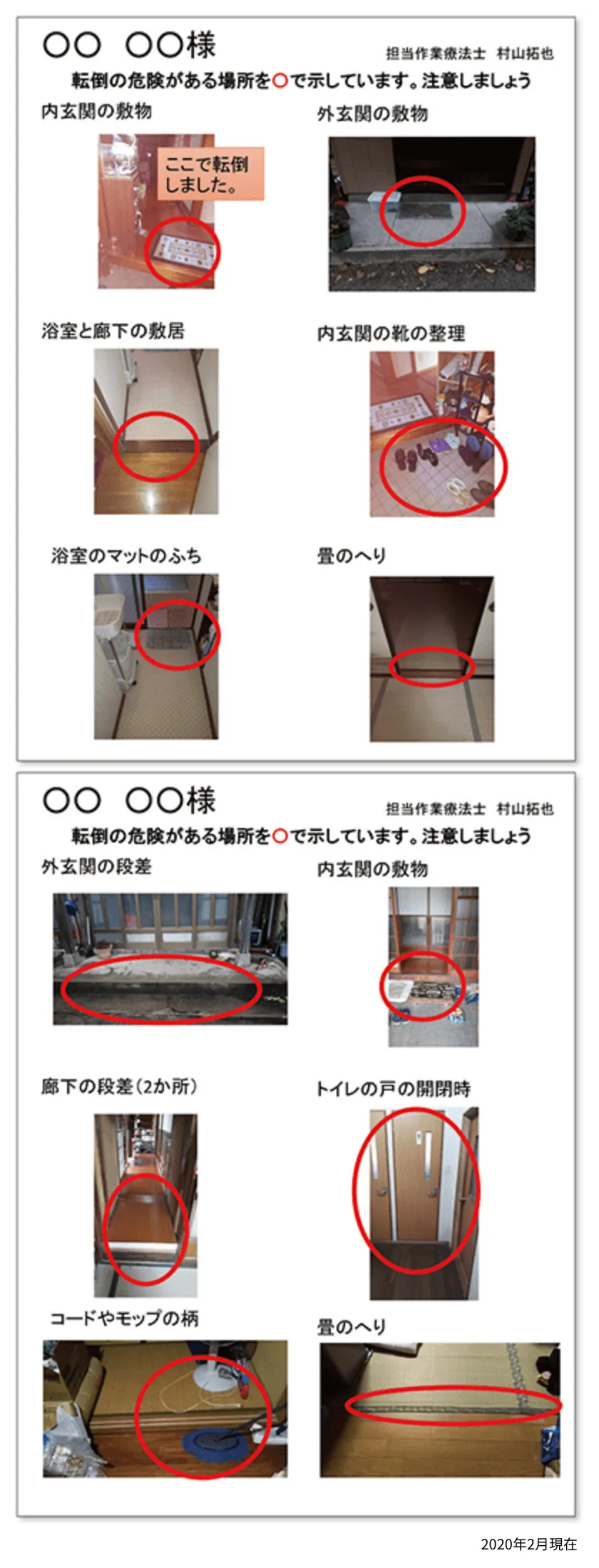 - 結果は、ご自宅で撮影してきた写真の、転倒の心配がある箇所に丸を付け、訪問指導書として「再骨折予防手帳」に貼ってお渡ししている。