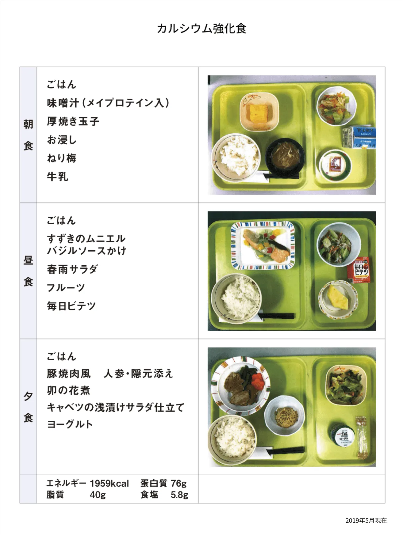 - 糖尿病食をベースに乳製品やカルシウム強化飲料を追加し、カルシウム強化食として提供