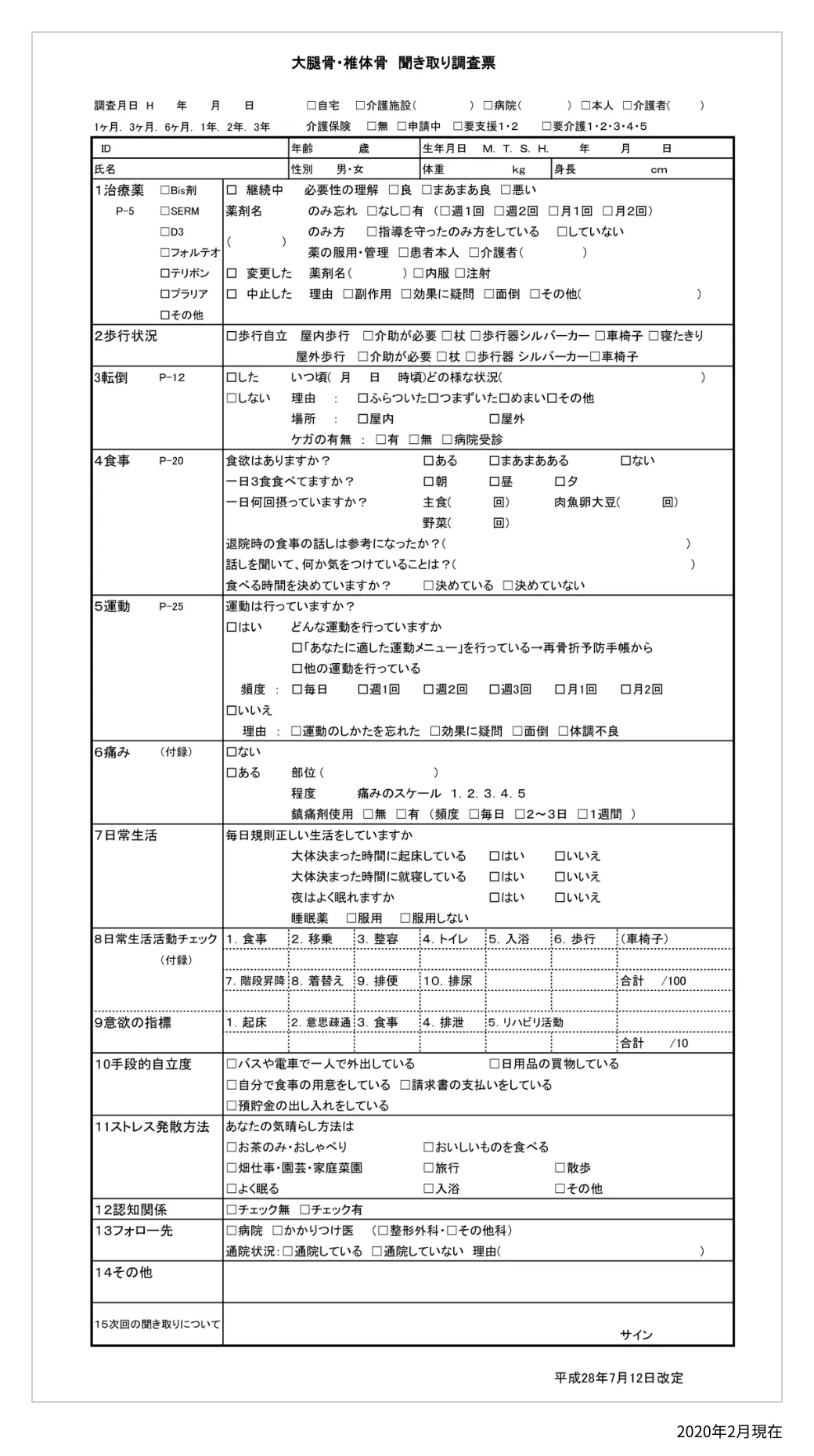 大腿骨近位部骨折では退院3、6カ月後と1年後の計3回、臨床椎体骨折では退院6カ月後と1年後の計2回、地域連携室の看護師と医療ソーシャルワーカーが「大腿骨・椎体骨 聞き取り調査票」を用いて電話でフォローアップを実施しています。