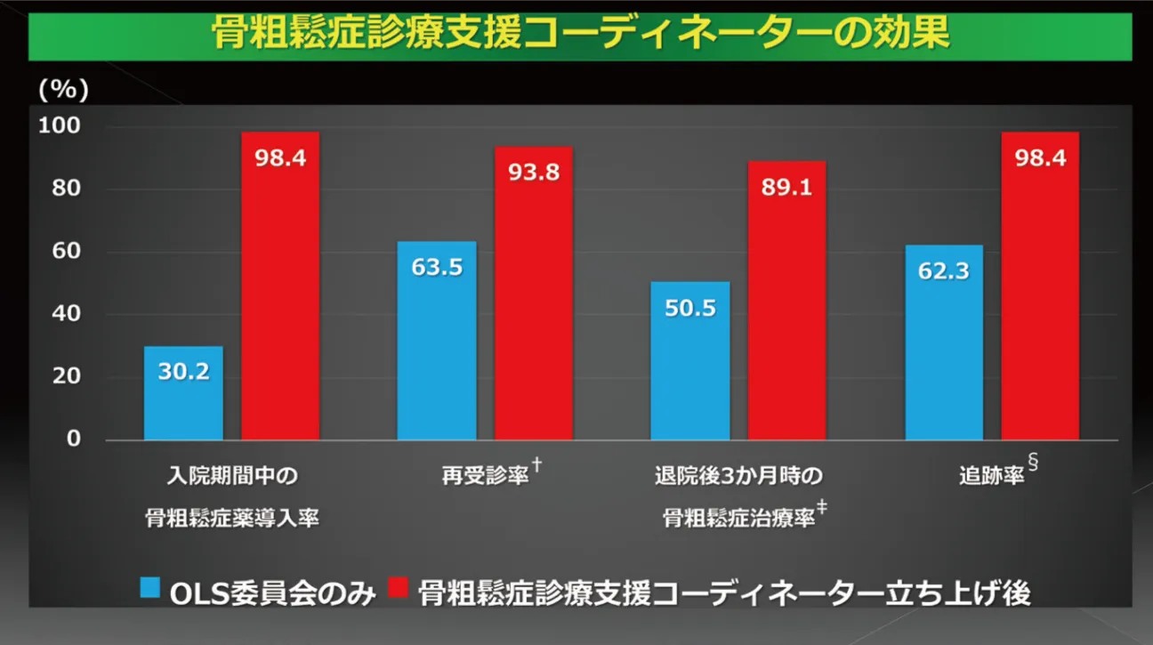 - 骨粗鬆症診療を支援する専属部署の事務スタッフ(コーディネーター)が、①入院患者さんの脆弱性骨折の発見およびスタッフへの周知、②骨粗鬆症治療導入のチェックと患者さんのデータベース化ならびに投薬状況の管理、③外来患者さんの再診管理および他院への適切な診療情報提供書の作成を担当している。