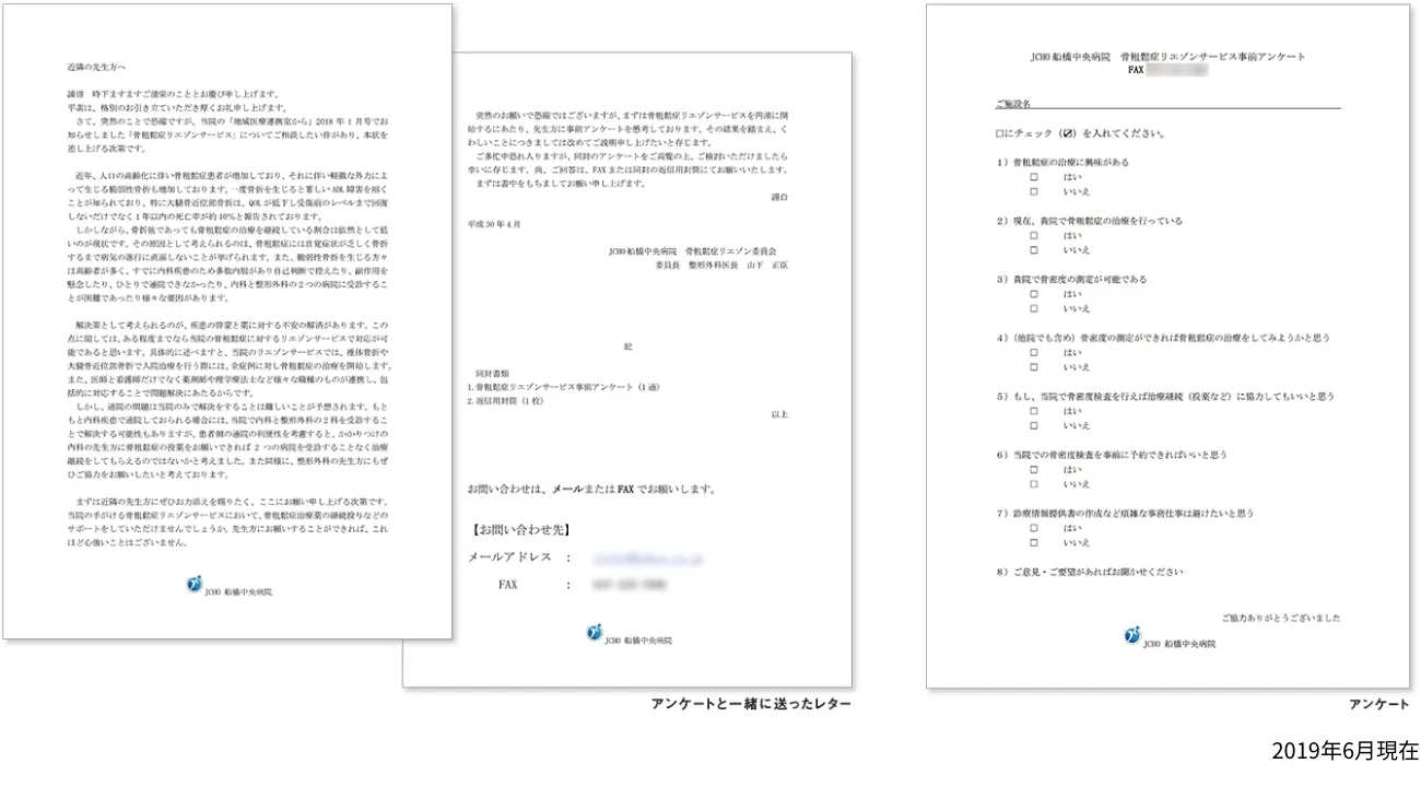 FLSの運用開始に当たり、医療ソーシャルワーカーと事務が地域の医療機関にアンケートを実施し、骨粗鬆症治療や骨密度測定の状況などを調査して、より良い連携体制を検討するための材料にしました。