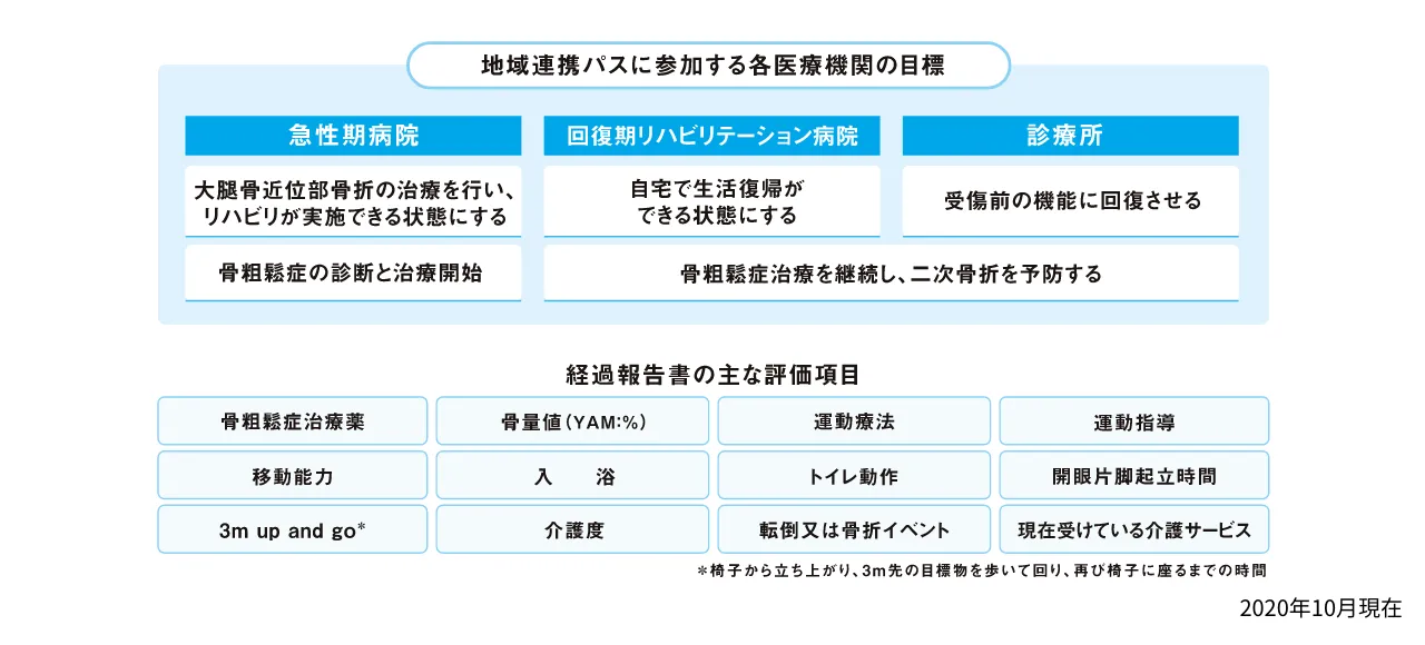 - 2012年に地域連携パスに参加する医療機関で協議し、急性期病院で処方された治療薬は回復期リハビリテーション病院や診療所でも継続されやすいことから、急性期病院が率先して骨粗鬆症治療薬を処方することを申し合わせた。どの骨粗鬆症治療薬を処方するかは各医療機関の判断でよいとするルールで、急性期病院が積極的に骨粗鬆症治療薬の処方を行うようにしているのが特徴。