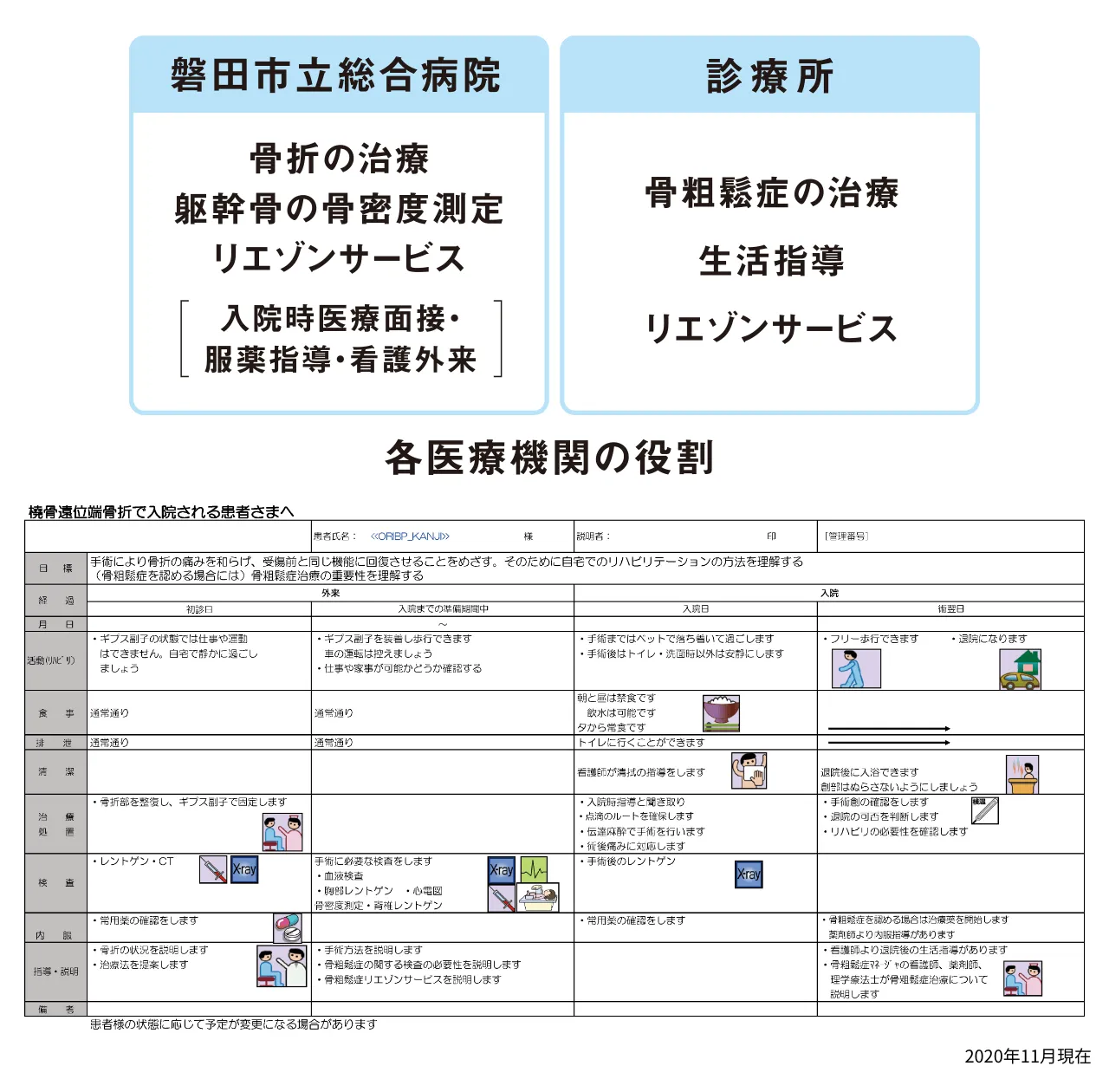 - 2006年に急性期病院と回復期リハビリテーション病院による病病連携という形でスタートした大腿骨近位部骨折の地域連携パスの実績や内容などを参考に、2018年より橈骨遠位端骨折の地域連携パスを独自に作成し運用している。