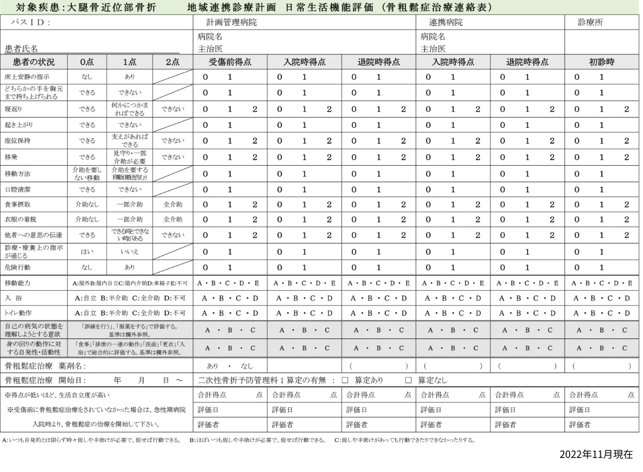 - 同院で大腿骨近位部骨折の治療に地域連携パスを用いた患者さんにおいては、回復期リハビリテーション病院や診療所に移る際、診療情報提供書等の書類と一緒に「日常生活機能評価(骨粗鬆症治療連絡表)」を患者さんへ、持参書類としてお渡ししている。