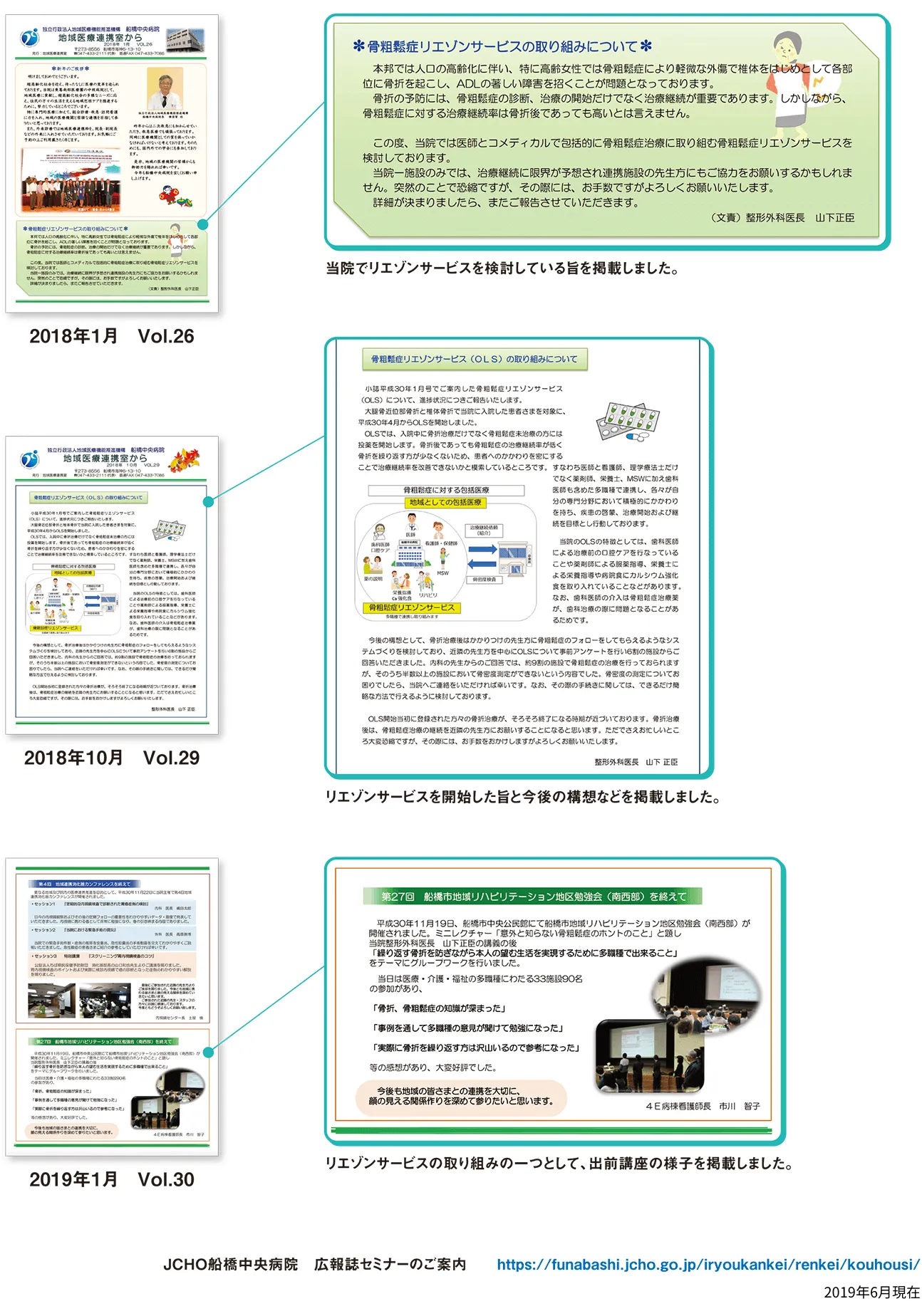 - 船橋市は講習会や勉強会の活動が盛んな地域であり、この機会を積極的に活用している。2018年11月に開催された「船橋市地域リハビリテーション地区勉強会」では整形外科医が医療・介護・福祉に関わる多職種に向けて、骨粗鬆症をテーマに「骨粗鬆症の病態」「骨粗鬆症の治療継続の重要性」「当施設のFLSの取り組み」に関する講演を行った。