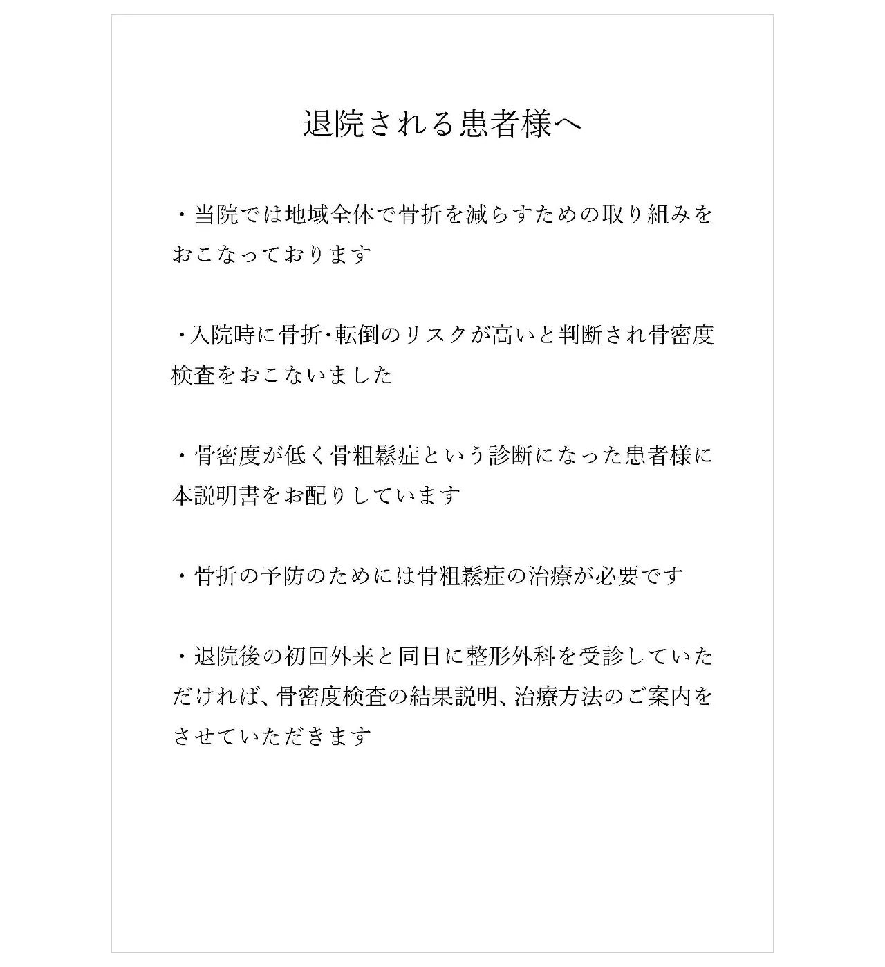 - 手紙は、整形外科に脆弱性骨折で入院された患者さん以外にも、全科で「入院時スクリーニング」を行い、骨粗鬆症と診断された患者さんに対して、退院時に病棟看護師がお渡しして説明している。後者に対しては、退院後初回外来時に、整形外科外来も併せて受診することを促している。