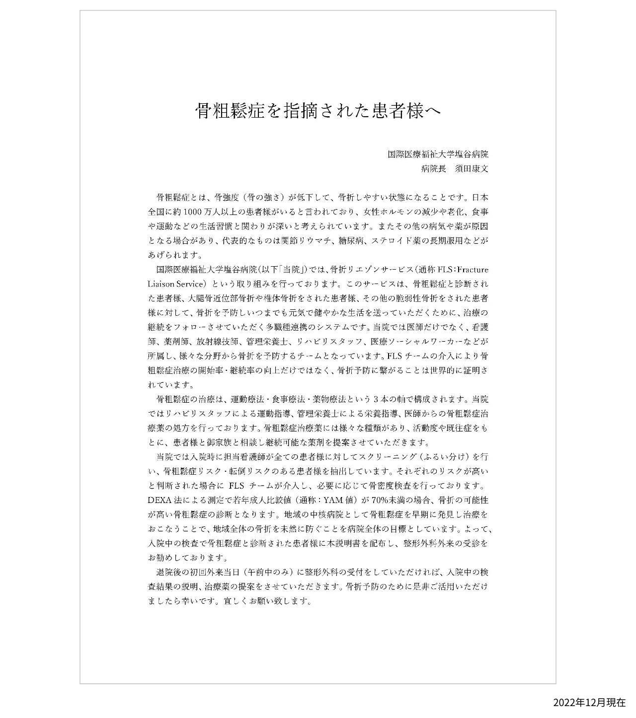 - 患者さんの退院時、骨粗鬆症と診断されたことを患者さん・ご家族ともにきちんと認識してもらう目的で、骨粗鬆症の原因やその治療法、同施設のFLSの取り組みについて説明された手紙を渡している。