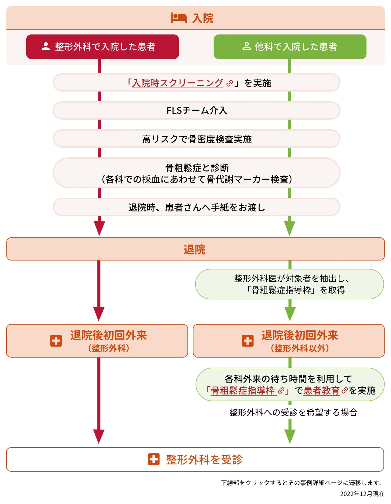 - 現在、退院後初回外来時の整形外科外来への受診率を強化するために、「骨粗鬆症指導枠」という新たな取り組みを開始している。