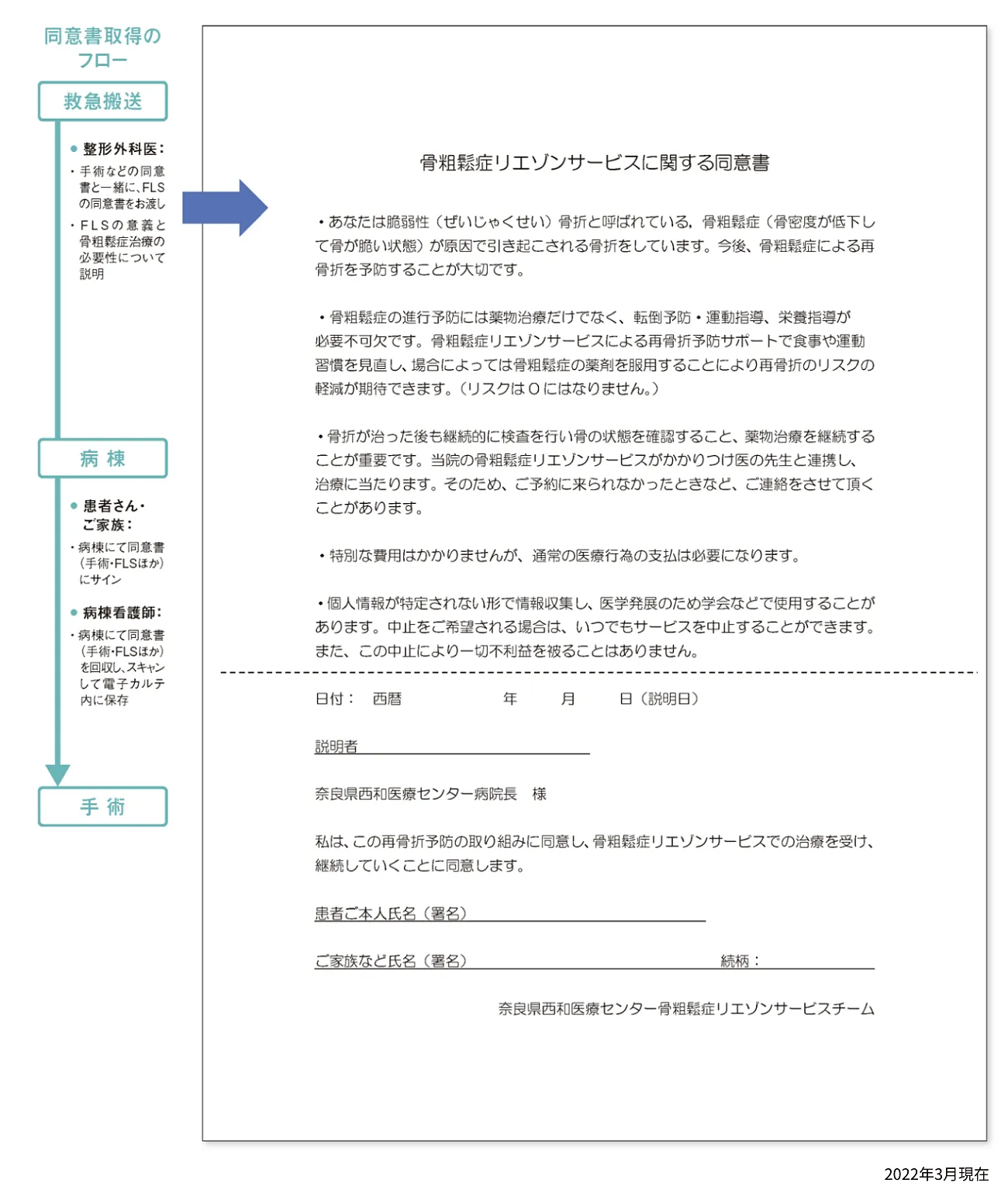 ご家族も同席される⼿術説明の際、整形外科医が、脆弱性骨折で手術となる全患者さんに対してFLSの同意書をお渡しし、FLSの意義と⾻粗鬆症治療の必要性について説明しています。