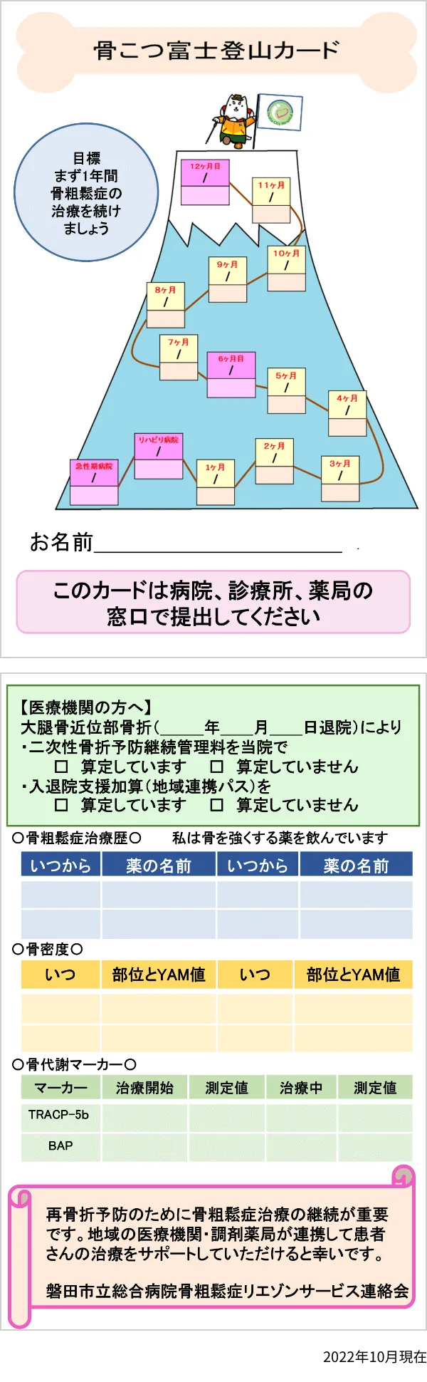 - 同院で治療を受けた大腿骨近位部骨折の患者さんの服薬状況を長期間チェックできるオリジナルの服薬確認カード「骨こつ富士登山カード」を作成し、活用
