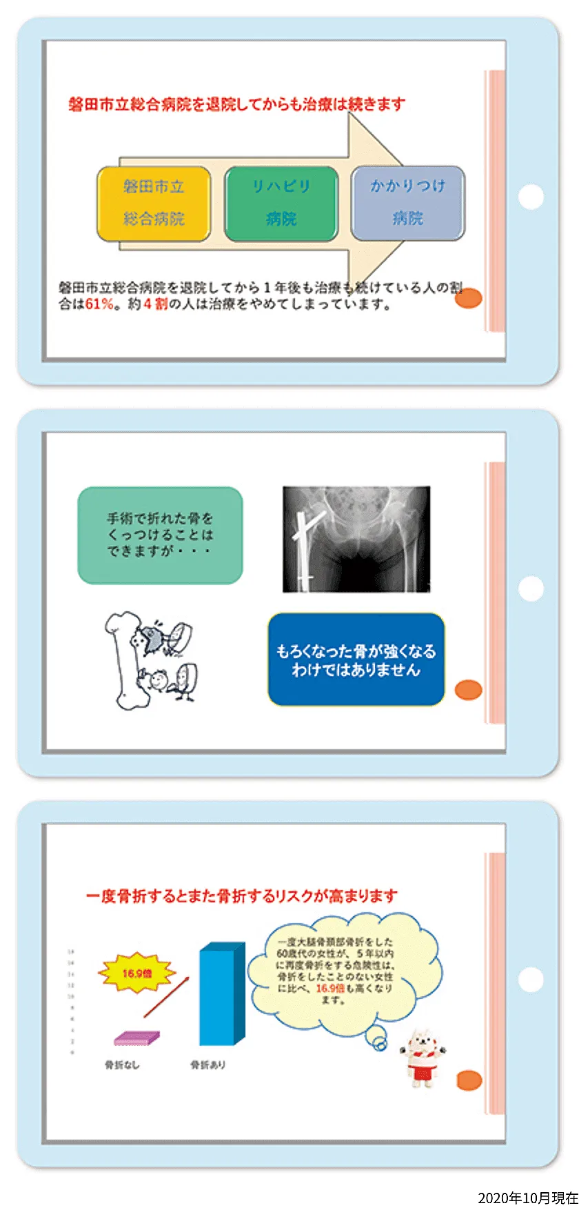 - 退院時の薬剤情報管理指導の際、薬剤師が患者さんやご家族に対して骨粗鬆症薬物治療の継続の重要性を伝える教育を、タブレット端末を用いて実施している。