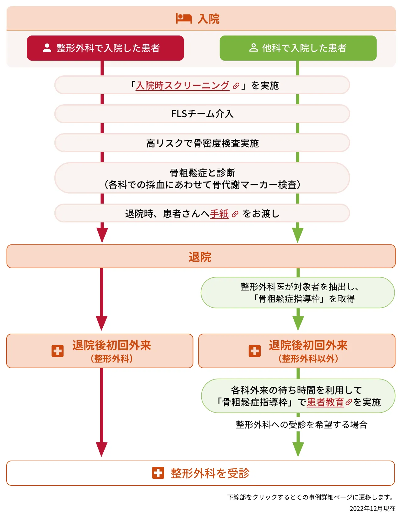 - 骨粗鬆症と診断された患者さんの退院時に、初回外来時に整形外科外来への受診を勧める手紙をお渡しする取り組みを行っているが、受診率向上につながらなかったことから、新たに本取り組みを行うこととした。