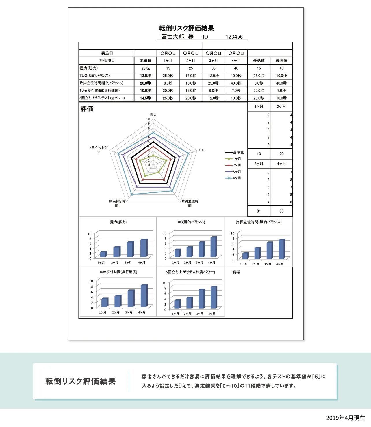 - 「握力」「TUG」「片脚立位時間」「10m歩行時間」「5回立ち上がりテスト」の5項目の運動機能テストを用いて定期的に転倒リスク評価を行い、その評価結果を患者さん、またはご家族に説明している。