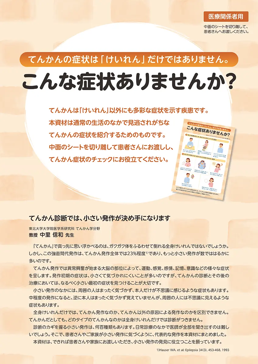 てんかん 資材 てんかんの症状は「けいれん」だけではありません。こんな症状ありませんか? 下記の画像をクリックしてPDFをダウンロードできます 詳細をみる(PDF) 気づかれにくいてんかんの症状についてチェックできるツールです 検索結果に戻る 資料請求先 各資材をご希望の際には、ユーシービージャパン株式会社担当MRもしくは、ユーシービーケアーズ コンタクトセンターにご連絡ください。 ユーシービーケアーズ コンタクトセンター 0120–093-189 受付時間:9:00~17:30(土日・祝日・会社休日を除く) Webからの請求はこちらから 医療ナレッジ検索はこちら ※本サイトに掲載されている内容や監修・出演の医療関係者の皆様のご所属などは制作当時のものとなります。現在と異なる場合もございますが、ご了承ください。