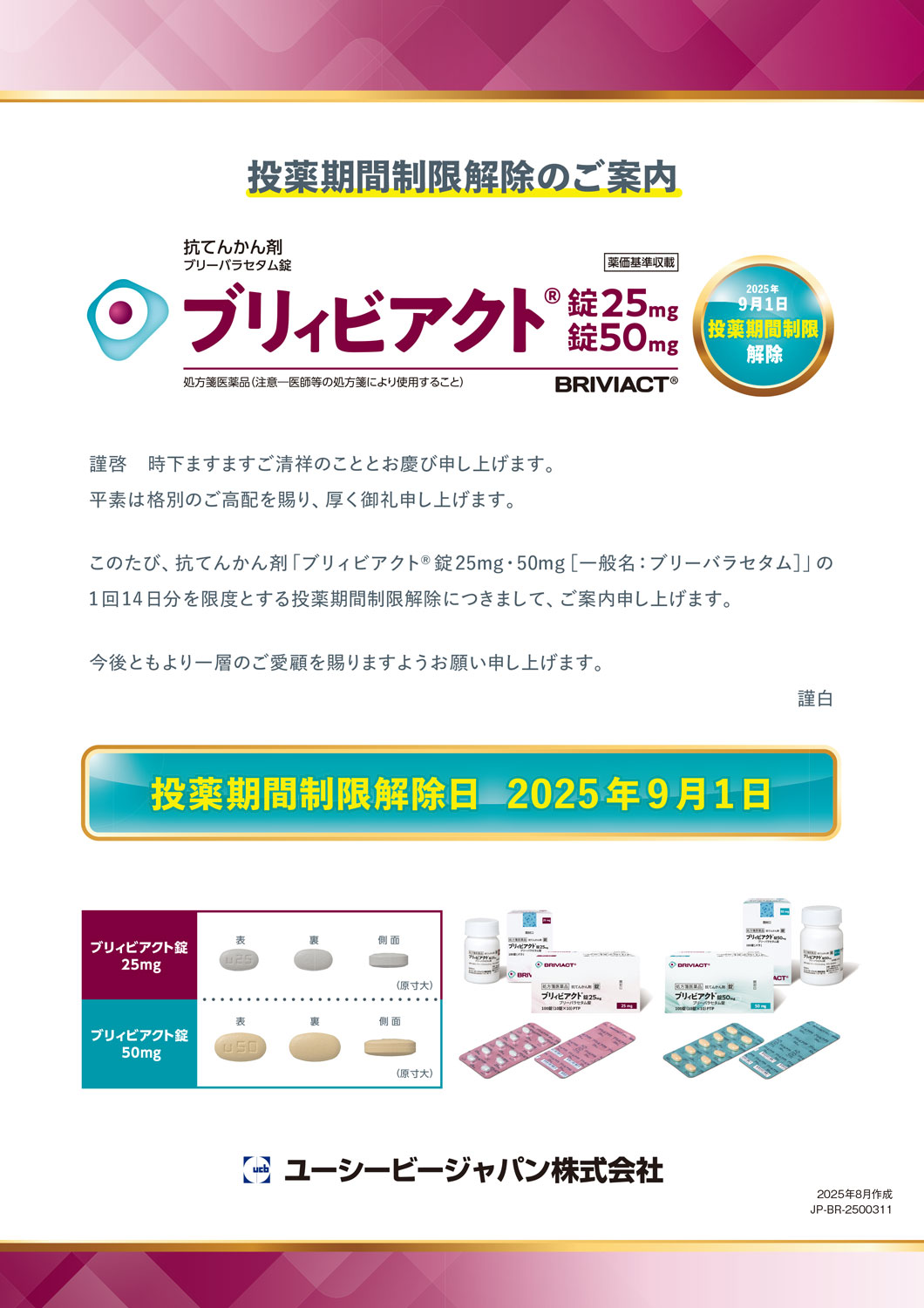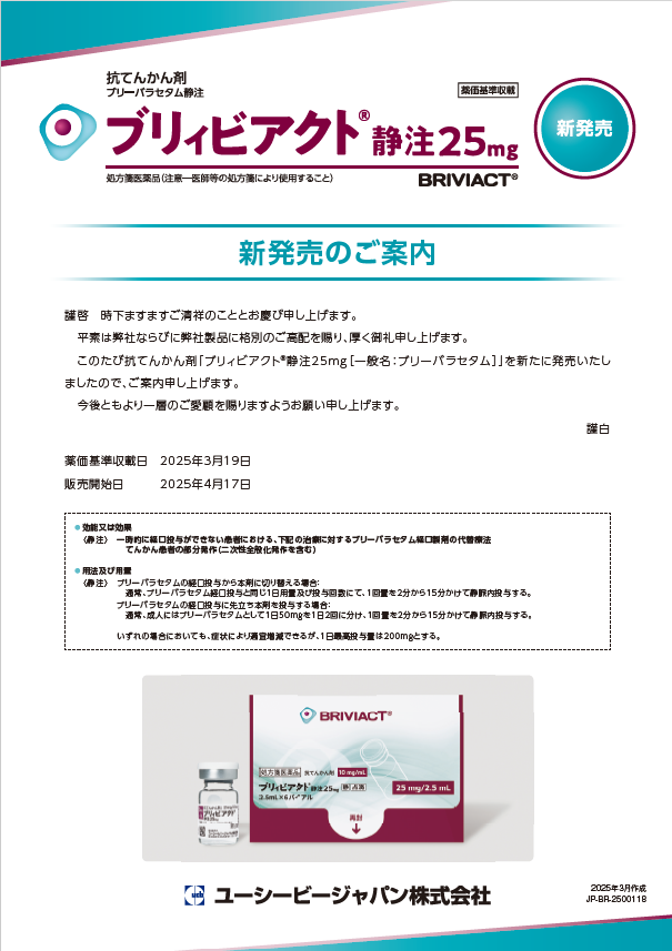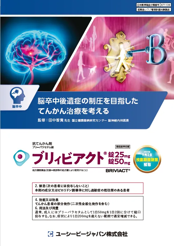 ブリィビアクト製品関連情報 画像 ブリィビアクトTop 製品基本情報 ブリィビアクトについて てんかん治療における意義 Webセミナー 疾患情報 製品基本情報 ブリィビアクト®錠25mg ブリィビアクト®錠50mg ブリィビアクト®静注25mg コンテンツ その他 ブリィビアクト 投薬期間制限解除のご案内 その他 抗てんかん剤「ブリィビアクト®静注25mg[一般名:ブリーバラセタム]」の新発売のお知らせ セミナー情報 WEBセミナー てんかん UCB-EPI-Webセミナー てんかんWebセミナー 日時: 2025年11月25日 (火) 18:30-19:15 座長 小出 泰道 先生 小出内科神経科 院長 演者 田中 智貴 先生 国立循環器病研究センター 脳神経内科 医長 主催 : ユーシービージャパン株式会社 ウェブセミナー一覧を見る 患者さん指導用ツール ブリィビアクト 資材 患者指導せん ブリィビアクトを服用される方へ ブリィビアクト 資材 ブリィビアクトを服用される方へ 患者さん指導用ツール一覧を見る 医療ナレッジ ブリィビアクト 資材 脳卒中後遺症の制圧を目指したてんかん治療を考える ブリィビアクト 動画 高齢者てんかんに対するブリィビアクトの臨床成績 ブリィビアクト 動画 ブリィビアクト静注の特徴と使い方 医療ナレッジ資材一覧を見る